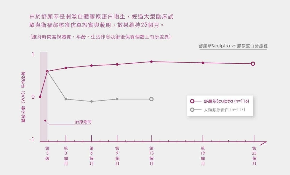 聚左旋乳酸Sculptra 舒顏萃依照個人肌膚凹陷狀況,建議次數為1至3次,每次需間隔一個月,治療後約在一個月內會有豐潤緊實的感覺,膠原蛋白的增生將會持續六個月以上,經科學研究證實維持效果長達25個月,施打數次後即會使豐潤效果更加明顯。