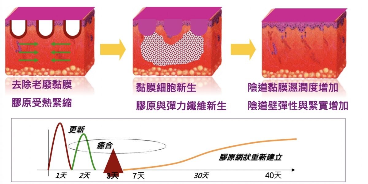 高峰脈衝剝離陰道老廢黏膜組織、瞬間引發膠原蛋白收縮、溫和熱能輸出,引發深層膠原結構變化、促進陰道黏膜與血管新生。