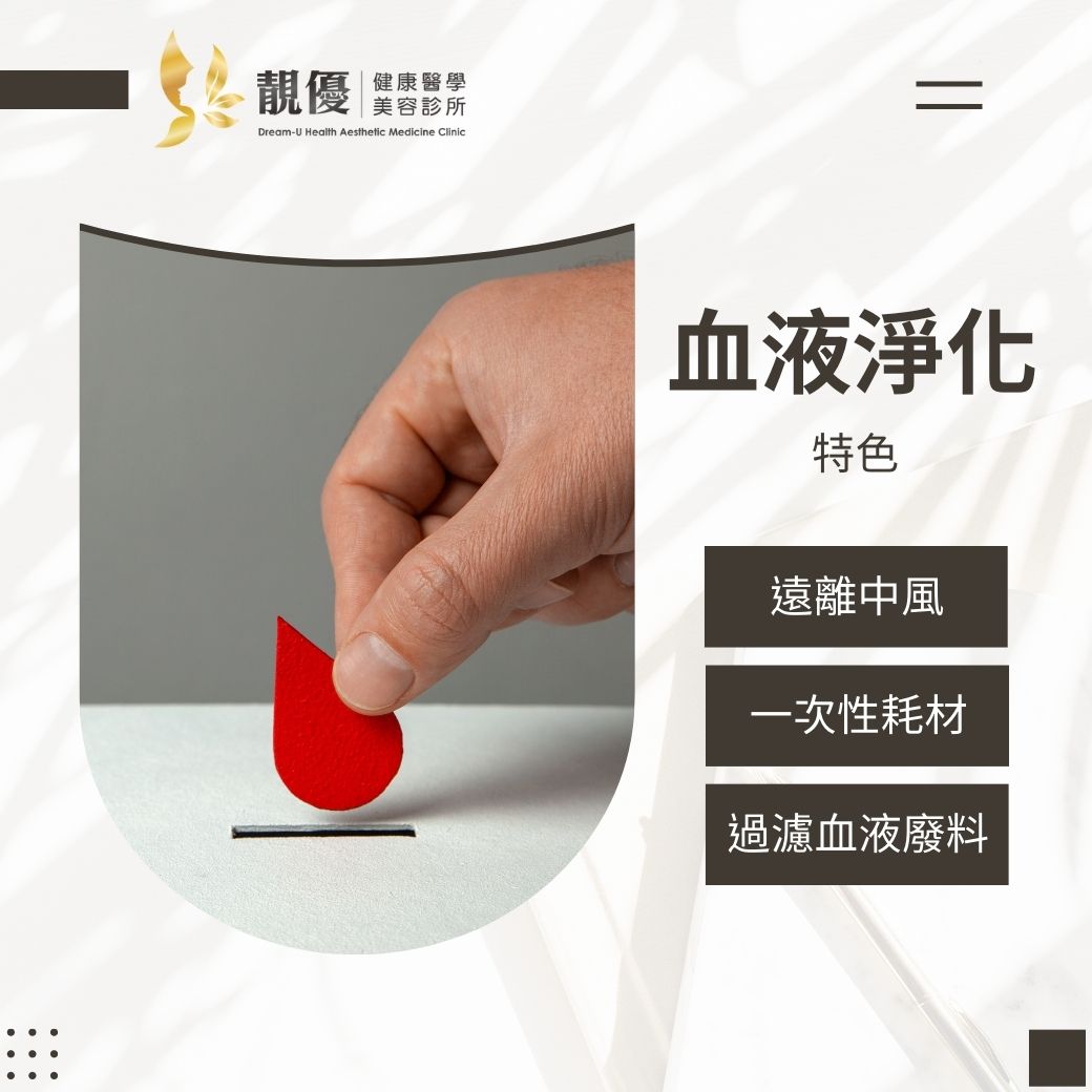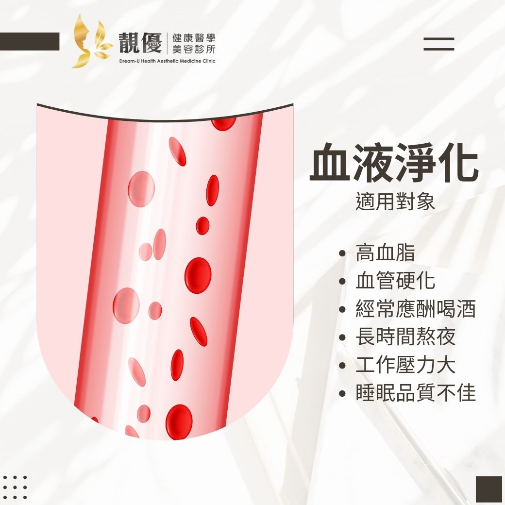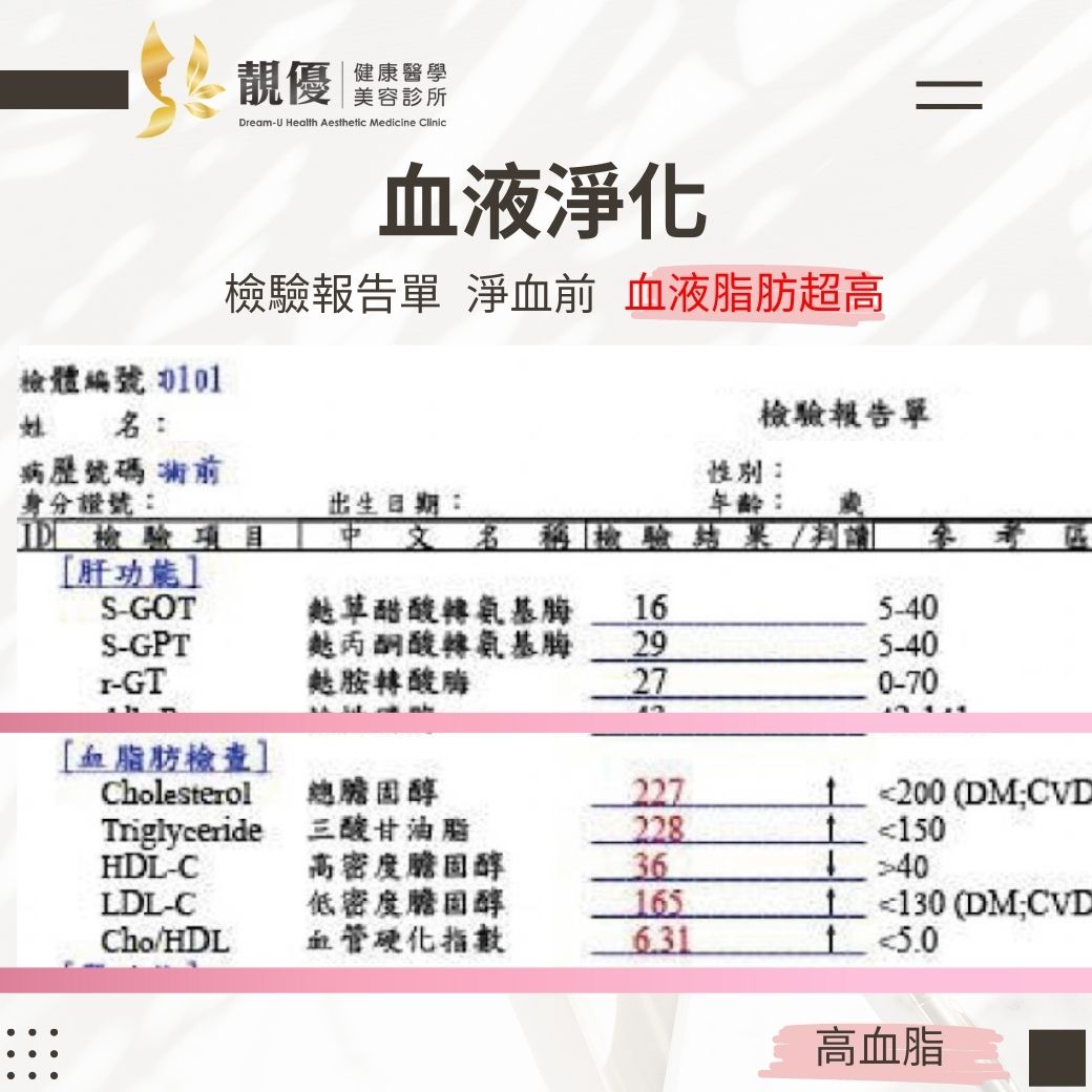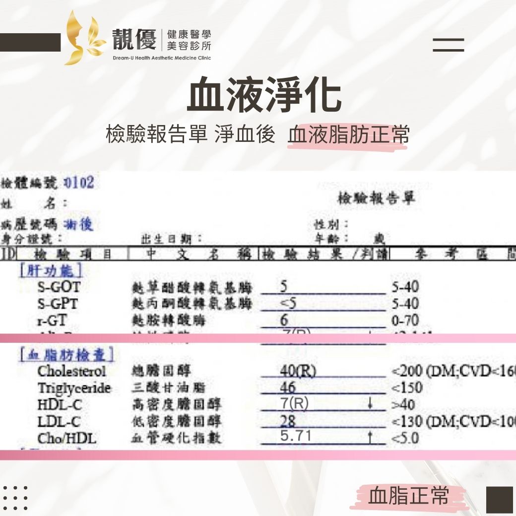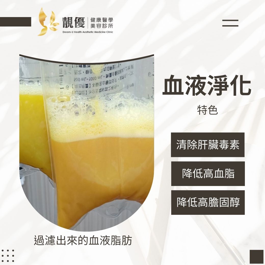 - 血液淨化療程可以藉由過濾器,分離血球及血漿,再將血漿中的大分子過濾並有選擇性地排除體內過多的膽固醇、三酸甘油脂等致病物質,不僅快速又有效,療程結束後血液中各數值都會有明顯的改善。