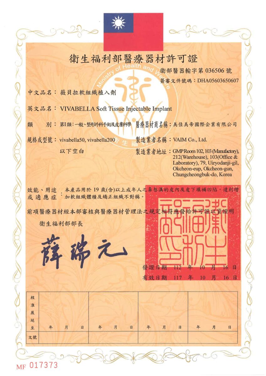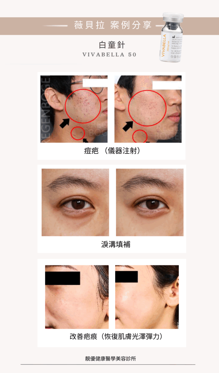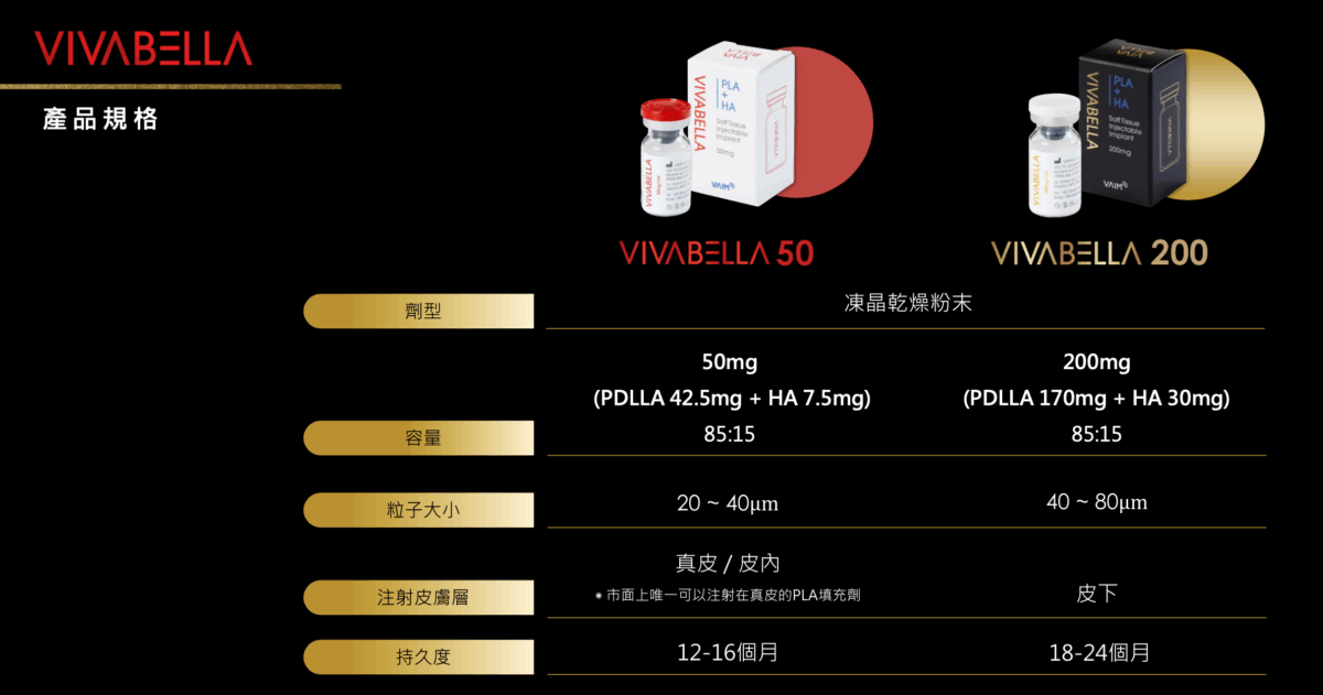 白童針(VIVABELLA 50)是由分子較小的50毫克小型PDLLA晶球和玻尿酸組成,可有效解決淺層組織的細紋、痘疤問題,同時改善整體膚質。這款填充劑是少數通過台灣衛生福利部認可可作用於真皮層的產品之一。由於其分子細緻柔軟,使用後不容易出現結節、毛毛蟲或浮腫等問題。
