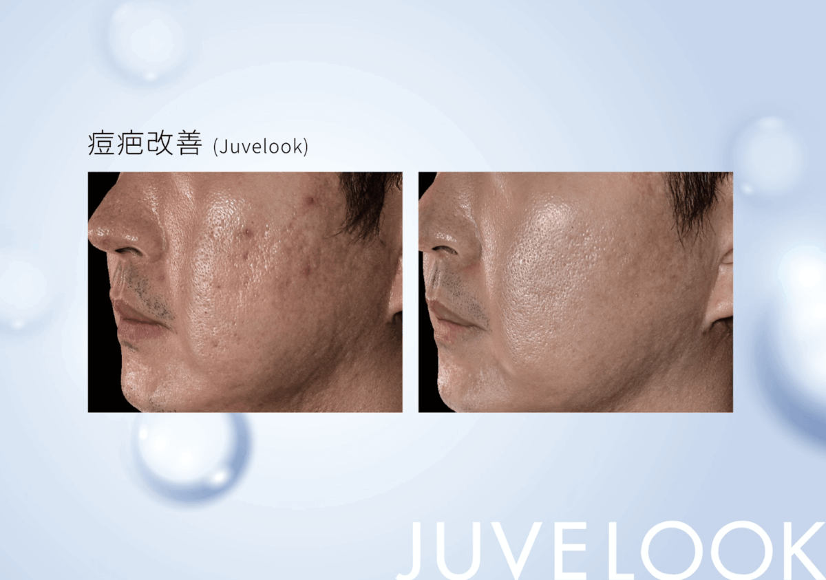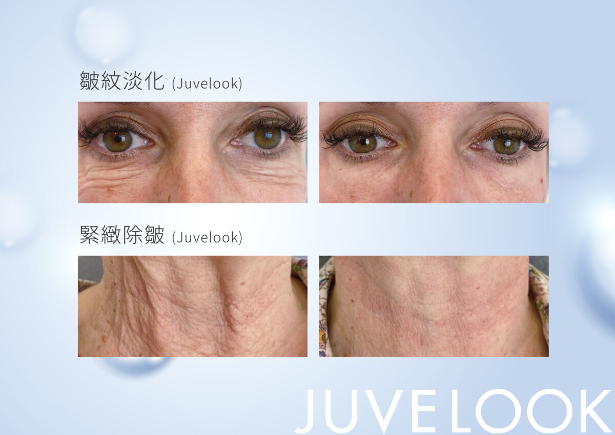 Juvelook 50mg的微粒較小,適合淺層注射如真皮層,對於膚質紋理改善有極大的幫助,因此常被應用於疤痕、全臉水光等治療。此外針對皮膚較薄處的凹陷填補,如淚溝、頸紋等,也有不錯的效果。