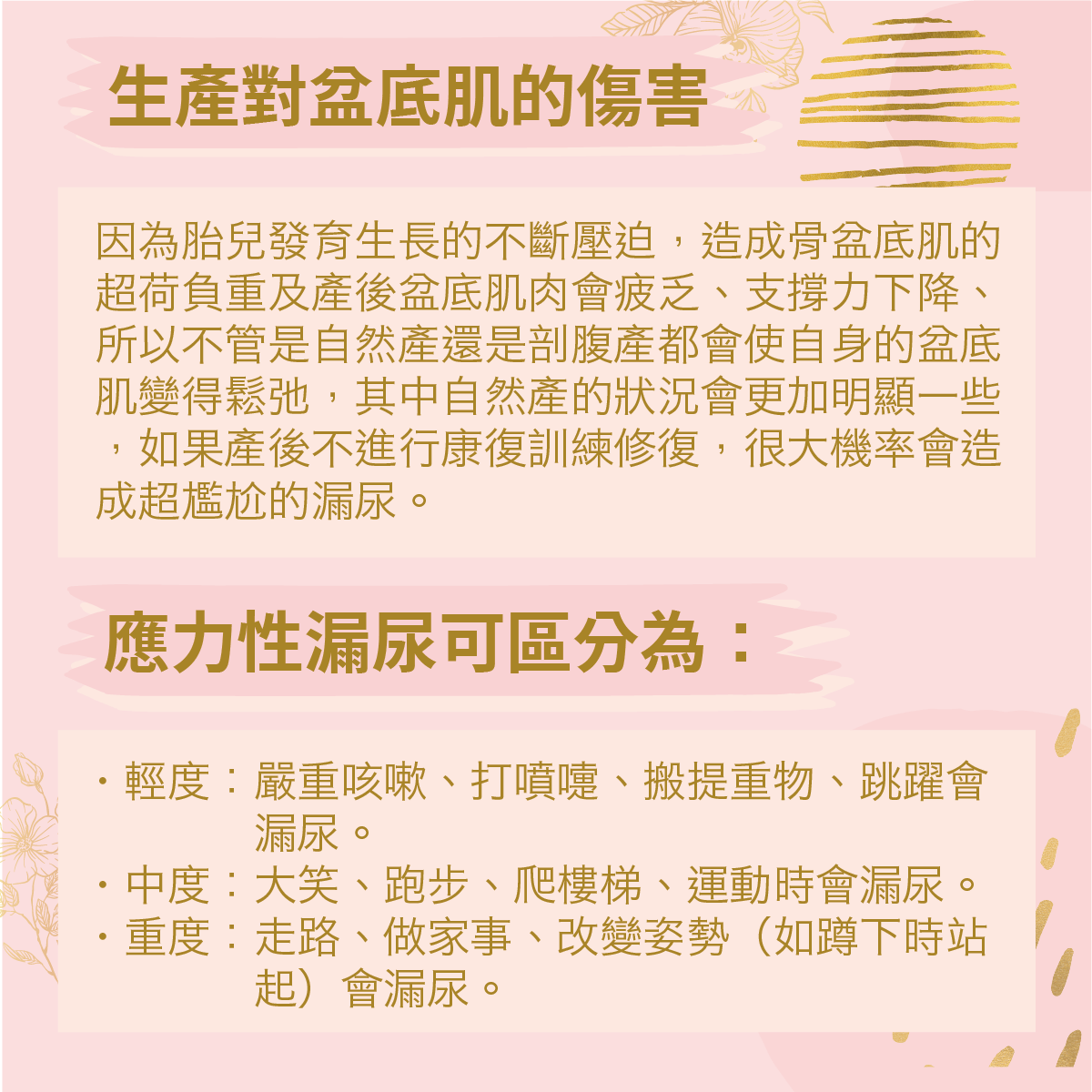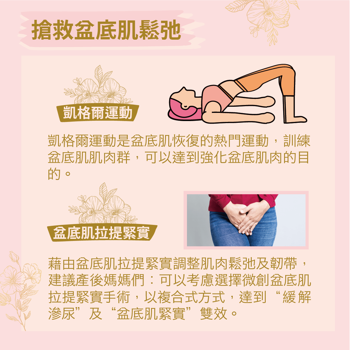 女人要懂得保養自己,除了外表、線條,其實女性私密部位同樣需要修護! 伴隨年齡增長、肥胖、缺乏運動或生育,都會令盆底肌開始鬆弛,如果產後媽媽有盆底肌障礙等症狀的話,就很容易引起陰道鬆弛、性交疼、漏尿、尿失禁、陰道壁膨出、子宮脫垂和器官下垂等私密困擾,影響日常生活以及與伴侶的親密關係。根據最近資料統計,25至55歲之間婦女當中約有20%,55歲以上約有30%左右,有不同程度的尿失禁,許多婦女產後開始出現漏尿的困擾,而且隨年齡增加,尿失禁的情況會越來越明顯。但當凱格爾不給力時,鄭嘉琪醫師建議產後媽媽們:可以考